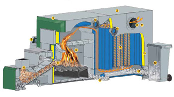 Cuerpo de la caldera con aislamiento eficiente . Doble alimentador de entrada motorizado. Sistema de aspiración con variador de frecuencia. Sistema primario y secundario con variador de frecuencia. Limpieza del intercambiador. Sistema de seguridad de sobre temperatura. Sistema de seguridad antiincendio contra el retorno de la llama. Depósito intermedio con control de nivel mediante infrarrojos. Encendido automático mediante ventilador con aire caliente. Sistema automático de extracción de cenizas del módulo de combustión. Sistema de parrilla móvil con limpieza automática. Sistema automático de regulación de la compuerta de humos. Regulación integrada mediante sistema "BioControl 3000" con pantalla LCD. Regulación de combustión. Regulación mediante sonda LAMBDA. Controla flujo de aire de combustión y entrada de combustible. Regulación de depresión. Regulación del Acumulador. Activación de circuito de elevación de temperatura. Activación de la válvula motorizada para un rápido calentamiento del circuito de calefacción. Sistema de limpieza.