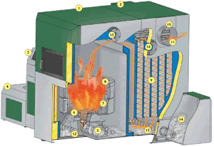 Cuerpo de la caldera con aislamiento eficiente. Alimentador de entrada motorizado. Sistema de aspiración con variador de frecuencia. Sistema primario y secundario con variador de frecuencia. Limpieza del intercambiador. Sistema de seguridad de sobre temperatura. Sistema de seguridad antiincendio contra el retorno de la llama. Depósito intermedio con control de nivel mediante infrarrojos. Encendido automático mediante ventilador con aire caliente. Sistema automático de extracción de cenizas del módulo de combustión. Sistema automático de regulación de la compuerta de humos. Regulación integrada mediante sistema "BioControl 3000" con pantalla LCD. Regulación de combustión. Regulación mediante sonda LAMBDA. Controla flujo de aire de combustión y entrada de combustible. Regulación de depresión. Regulación del Acumulador. Activación de circuito de elevación de temperatura. Activación de la válvula motorizada para un rápido calentamiento del circuito de calefacción. Sistema de limpieza.